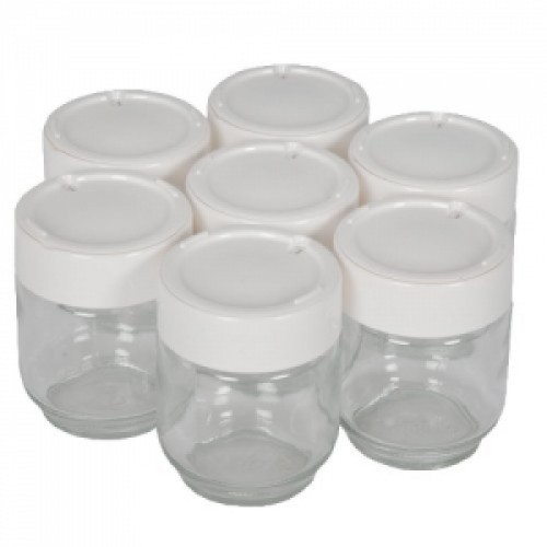Баночки, стаканчики для закваски йогурта для йогуртницы MOULINEX (МУЛИНЕКС) A14A03, комплект 7 шт. размеры примерно: диаметр по крышке 65 мм, высота почти 90 мм, цилиндрической формы (круглые). Объем одной баночки — 200 мл.