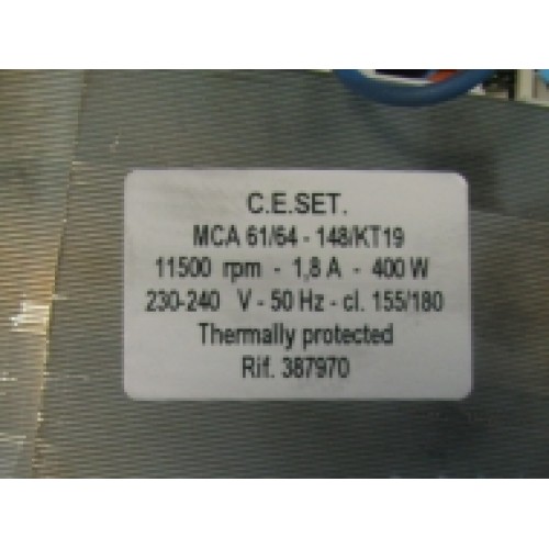 Мотор к стиралке имеет маркировку: C.E.SET MCA 61/64 - 148/KT19 11500rpm - 1.8 A - 400W 230-240 V 50Hz - cl. 155/180