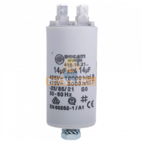 Пусковой конденсатор на 14µF. размер: Ø40x70mm. 10000h, 475V. Double faston 6,3mm and M8 tang.