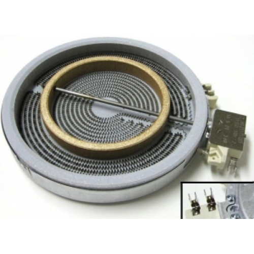 Электроконфорка для плиты, варочной поверхности Хотпоинт Аристон (Hotpoint-Ariston) Индезит (INDESIT) имеет размеры, общий диаметр 200 мм, внутренний диаметр (спираль, зона нагрева) 130 мм. Мощность общая 2400 W (Ватт), мощность одного круга 1700 W (Ватт), мощность второго круга 700 W (Ватт) двухзонная, зоны нагрева две, два круга нагрева, три спирали