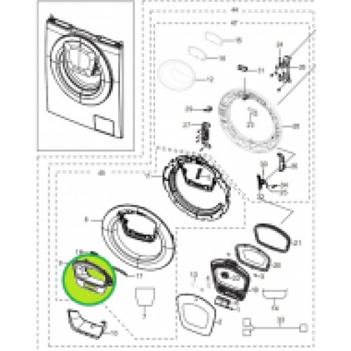 Дверку (люк, крышка) к стиральной машине SAMSUNG (Самсунг) поставляют в сборе с обрамлениями (переднее, задние), стеклом, петля, жгут проводки и дополнительная дверца