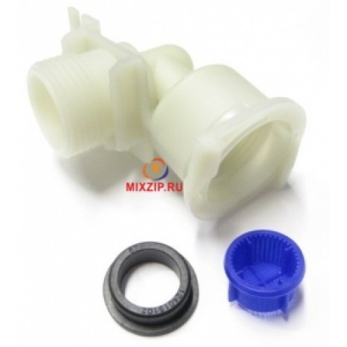 Пластиковый уголок с резьбой 3/4 и посадочным местом для заливного, электромагнитного клапана стиральной машины Электролюкс Занусси АЕГ (Electrolux, Zanussi, AEG), оригинальный, в комплекте: прокладка (уплотнитель, резинка) фильтр-сеточка, уголок