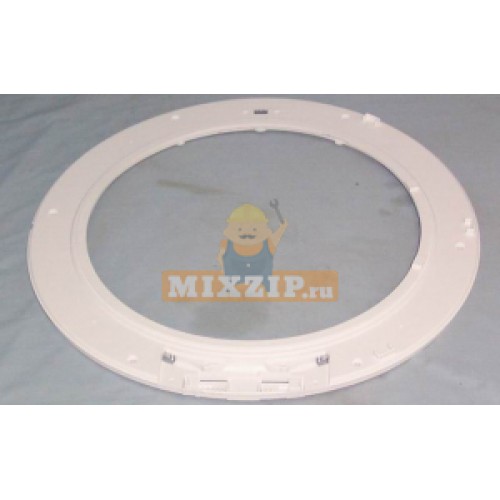 Кольцо на дверцу (люка) из пластика к стиральной машине поставляется отдельно, белого цвета, с отверстиями под саморезы (винты) и крючок (защелку), с посадочным местом под петлю (шарнир) дверцы.